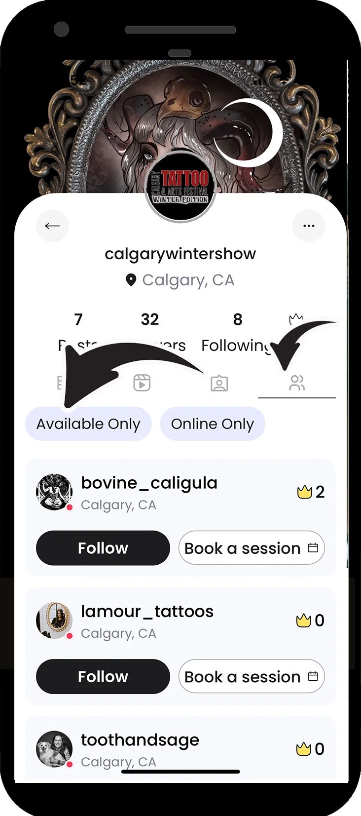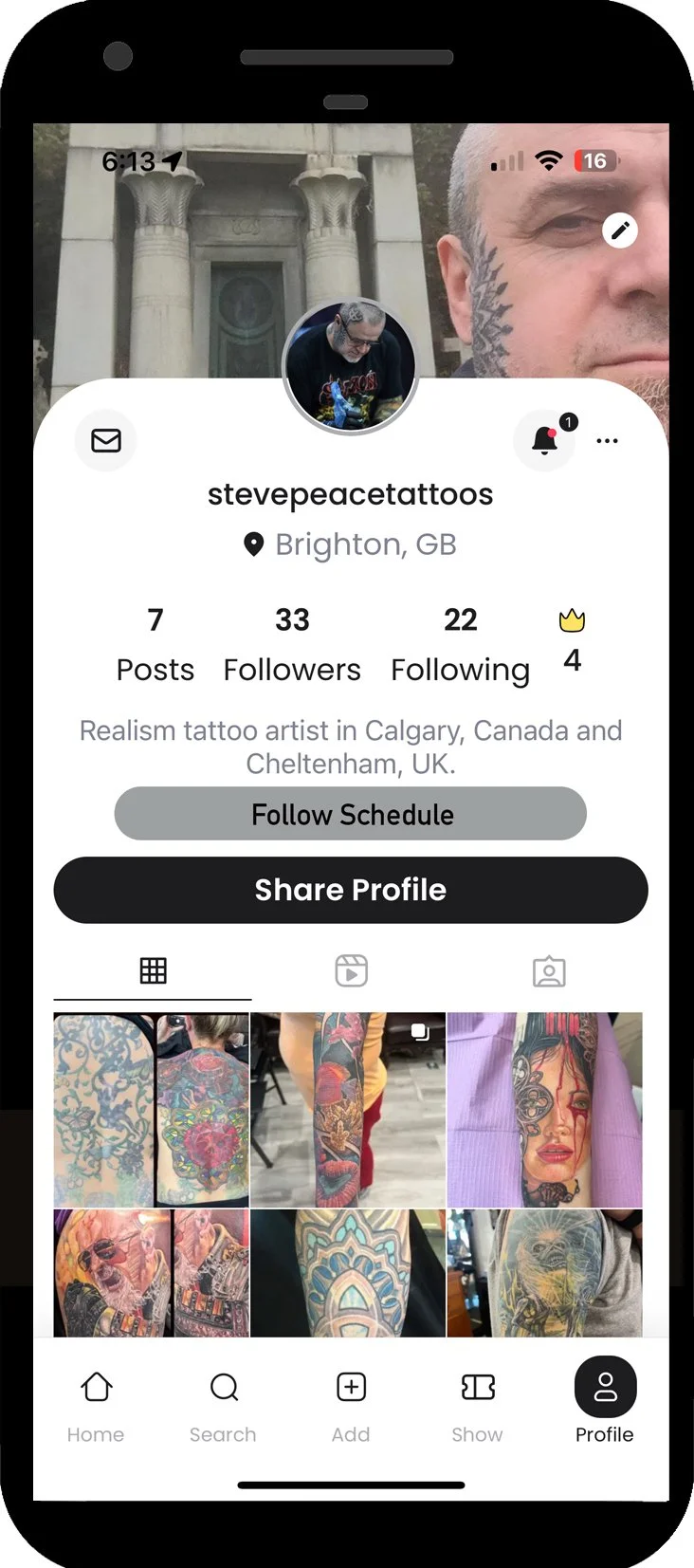 To get connected to a tattoo show that is on the app, the show promoters will tag your account and you will receive an invite in your notifications. Simply accept the invite and appear on the show artist listings. You can view the show artist listings by hitting the last icon on the show page.