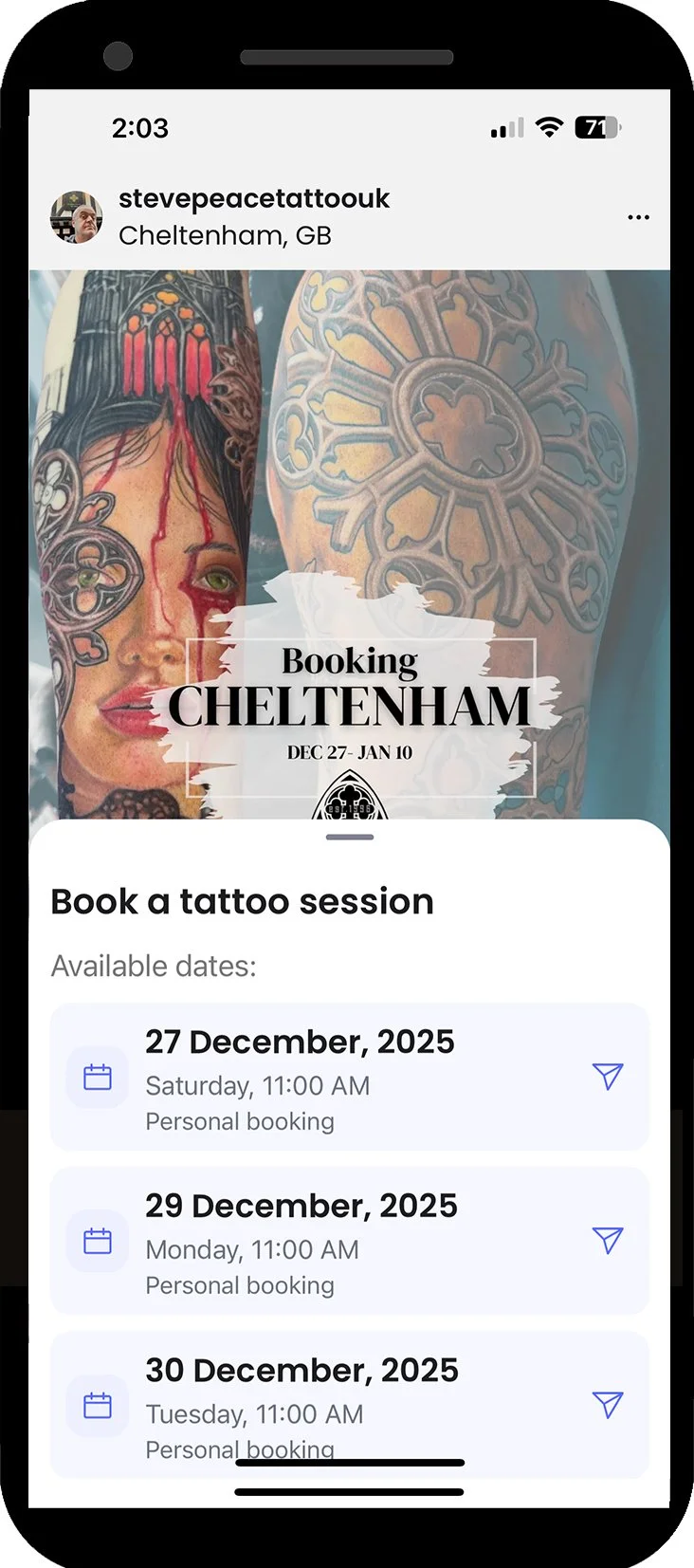 TattooDay does not limit the viewership of your posts. In fact, we show your posts to every client within your city, whether they follow you or not! Get maximum exposure to new clients on TattooDay.